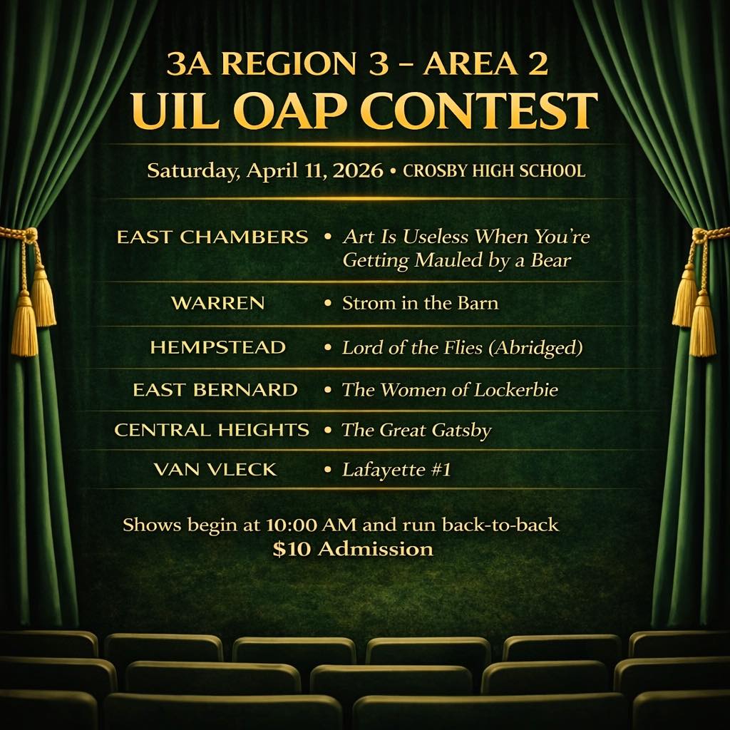 Our UIL One-Act Play team will travel to Crosby on Saturday, April 11, to compete at the Area level. They have been working hard and are ready to represent Hempstead ISD well. If you would like to attend, the show begins at 10:00 a.m., and The Hempstead Theatre Co. will perform third. The performances will run back-to-back.