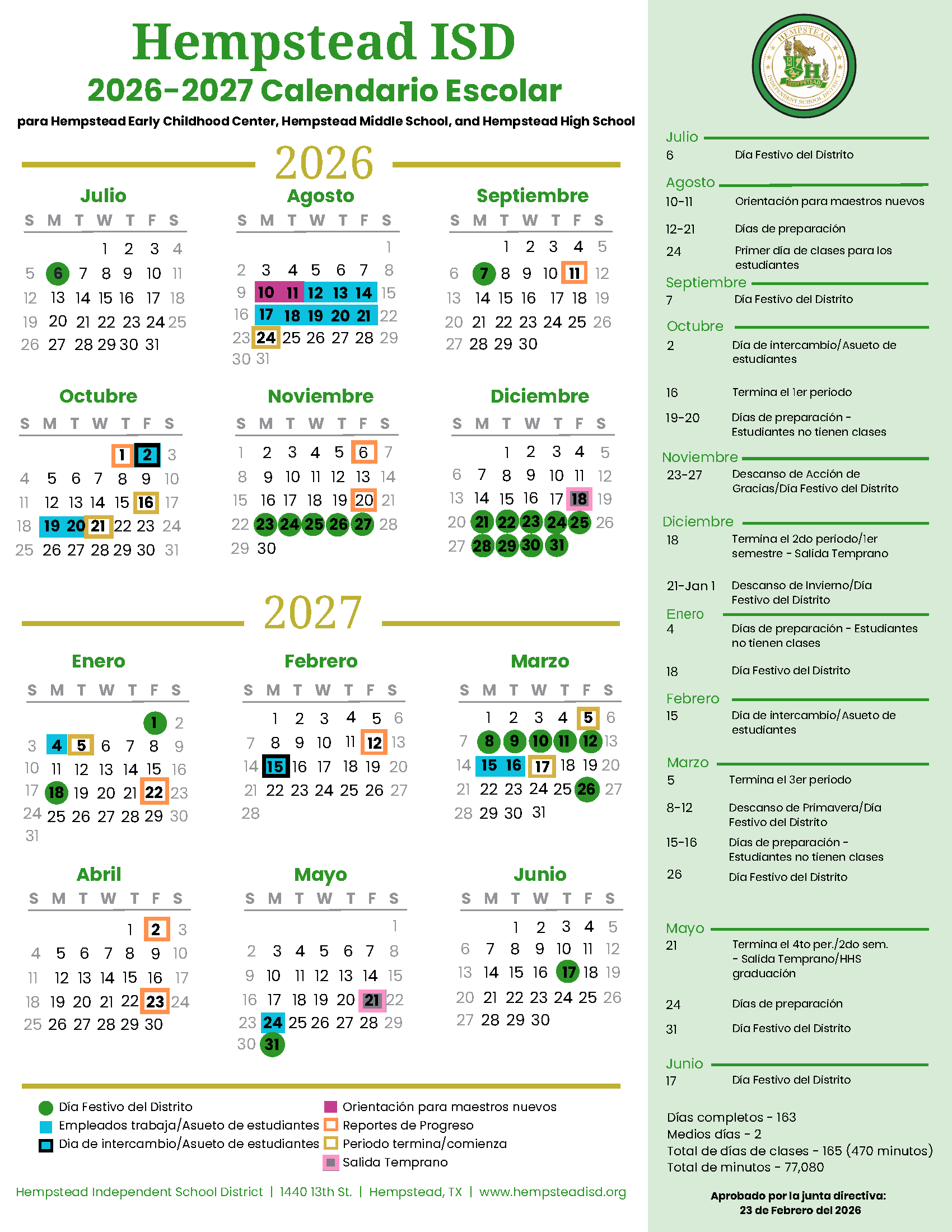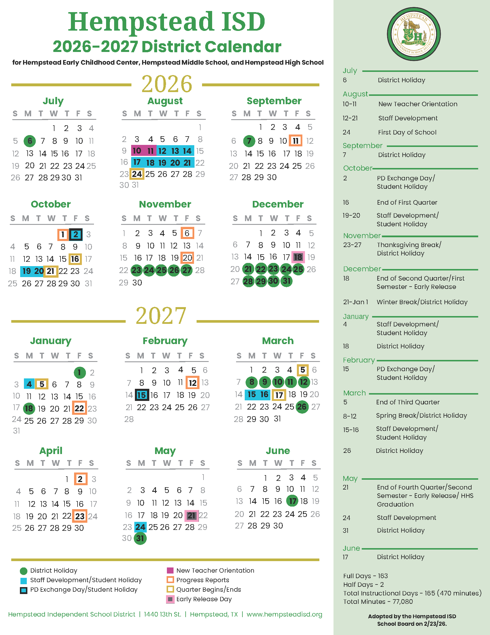 Hempstead Early Childhood, Middle School, & High School Calendar