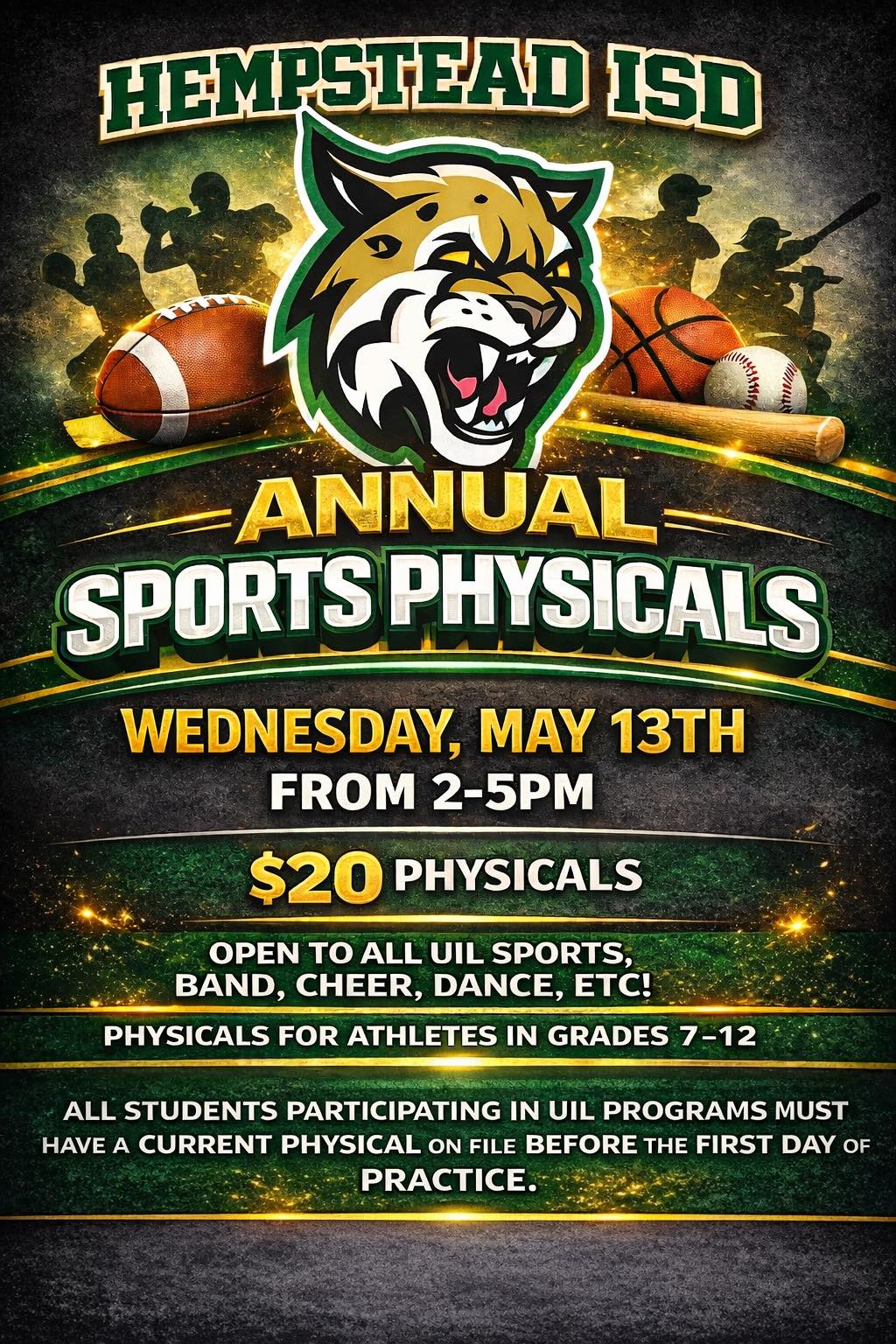 Hempstead ISD Bobcat Athletics will host the annual Sports Physicals from 2 to 5 p.m. on Wednesday, May 13.